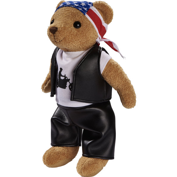 Orsetto motociclista dal pelo color marrone chiaro, alto ca. 28 cm. Pelo in morbido peluche. Con la sua divisa da motociclista autentica con pantaloni, gilet, T-shirt e bandana, si scatenerà a tutte le feste! Un orsetto "coccoloso" che fa compagnia a grandi e piccini.